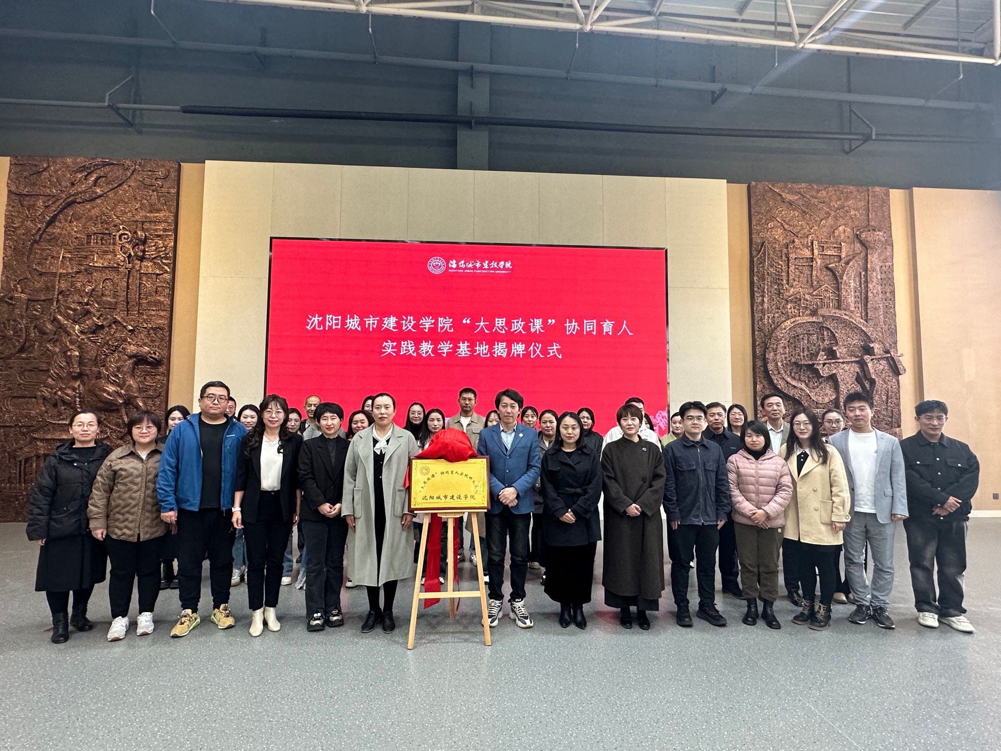 潘红与罗健共同为“大思政课”协同育人实践研究基地揭牌。仪式结束后,全体教师合影留念,并参观了沈阳城市建设展示馆。