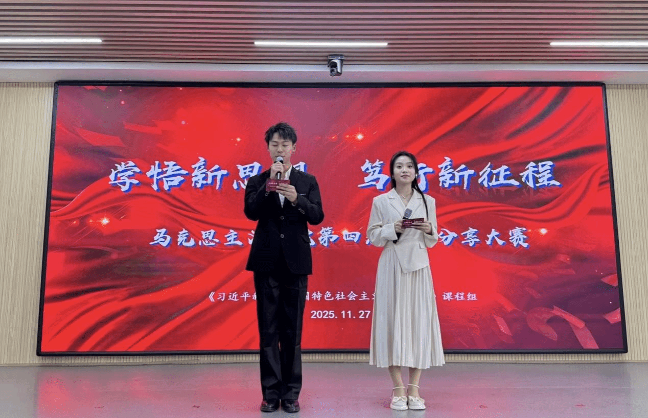 本次大赛依托于《习近平新时代中国特色社会主义思想概论》课程课内实践教学,自 202 5 年秋季学期 启动以来,本届读书分享大赛 历时近四个月,覆盖202 3 级2 4 00余名学生 。 课程 组 始终遵循“ 品读- 感悟 - 践行 - 收获”的实践模式, 系统设计了 教师导读、 撰写读书笔记、 心得分享、读书比赛 四 个 环节 ,形成有机衔接、层层深入的育人链条。读书比赛分为初赛、复赛、决赛三个阶段。各班学生在教师指导下全员登台分享,通过展示读书笔记、交流阅读感悟等形式,最终选拔出34名选手进入复赛。复赛阶段综合考察读书笔记质量与现场分享表现,经严格评审,7名选手脱颖而出,晋级决赛。